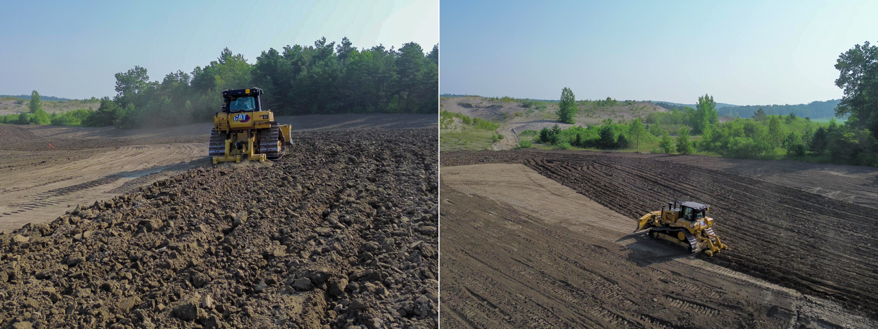 To prepare for soil importation, the depleted pit faces were pre-graded to create a rough final landform. Next, spanning over 3 weeks (June 24-July 14, 2025), topsoil from the two local fields was delivered to the site and graded to create a topsoil layer on the new agricultural lands. During this time, former pit faces, floor, and internal haul roads were graded into gentle rolling landscapes using the fine sands to create the sub-soil layer. After the importation, the internal route used by the trucks was ripped to alleviate soil compaction.